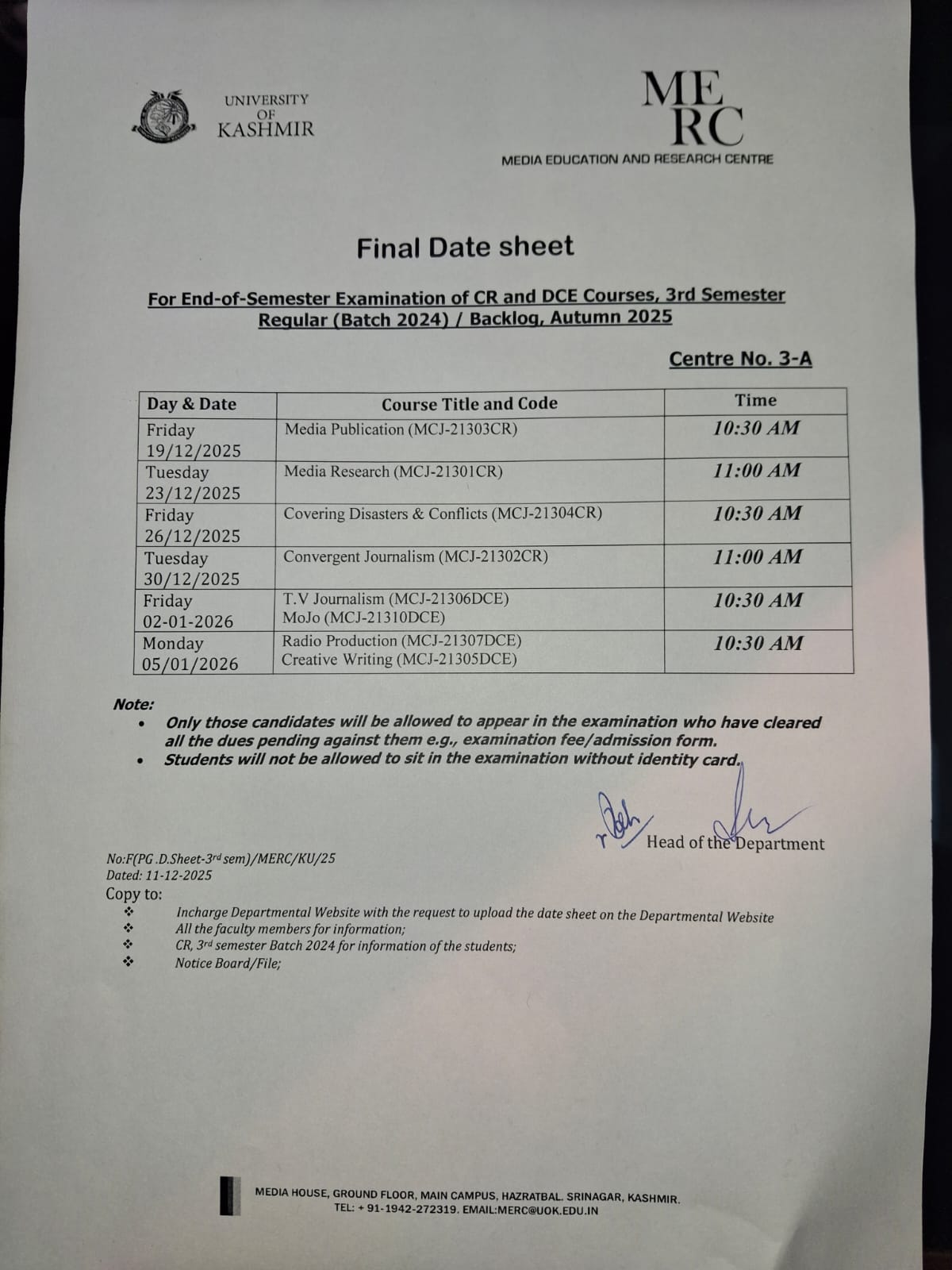 Date Sheet For End-of-Semester Examination of CR and DE Courses, 3rd Semester Regular (Batch 2024) / Backlog, Autumn 2025 Date Sheet View