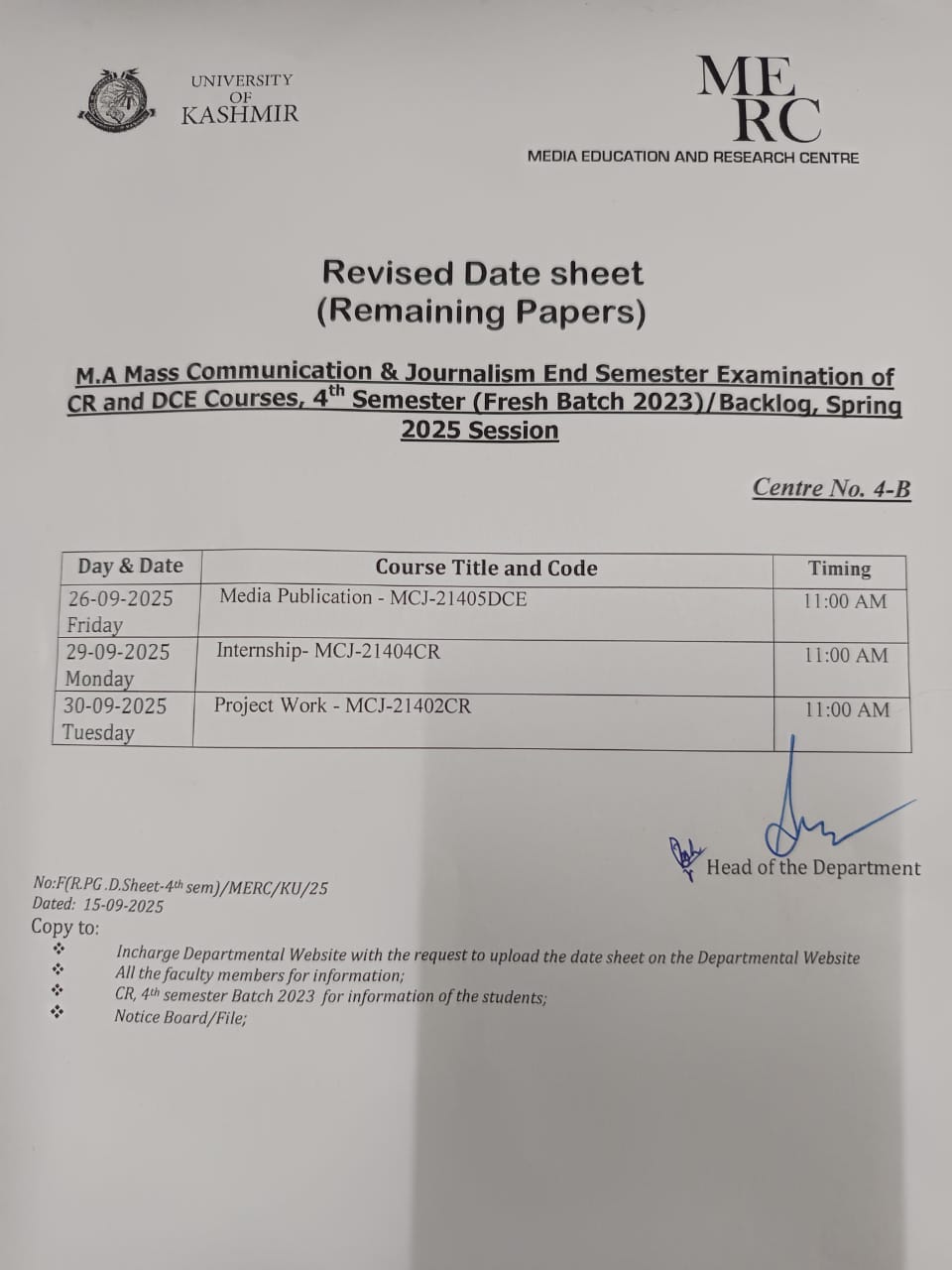 Revised Date sheet End Semester Examination of CR and DCE, 4th Semester (Fresh Batch 2023) / Backlog, Spring 2025 Session Date sheet View
