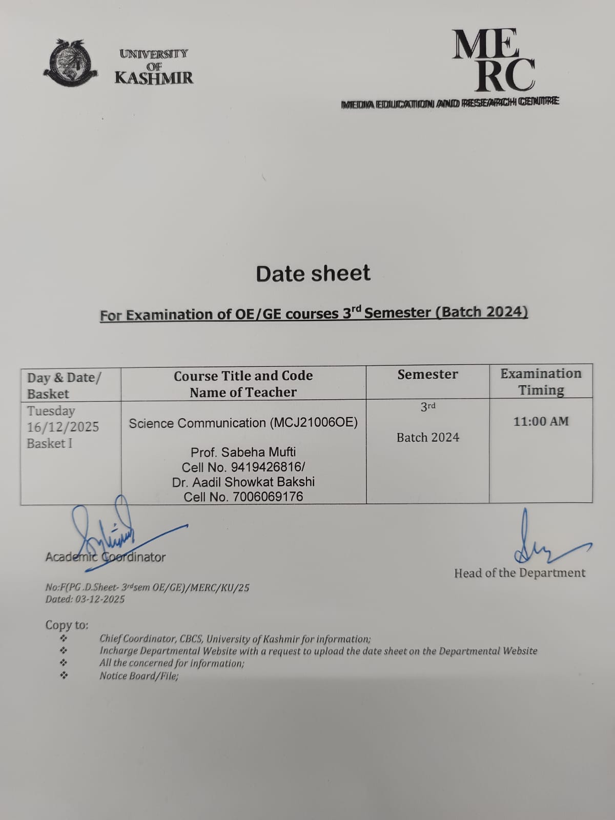 Date sheet For Examination of OE/GE courses 3rd Semester (Batch 2024)