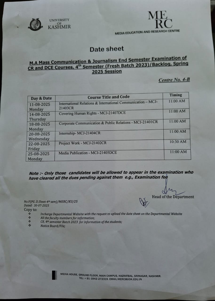 Date sheet for End Semester Examination of 4th Semester (Fresh Batch 2023)/ Backlog, Spring 2025 Session date sheet View