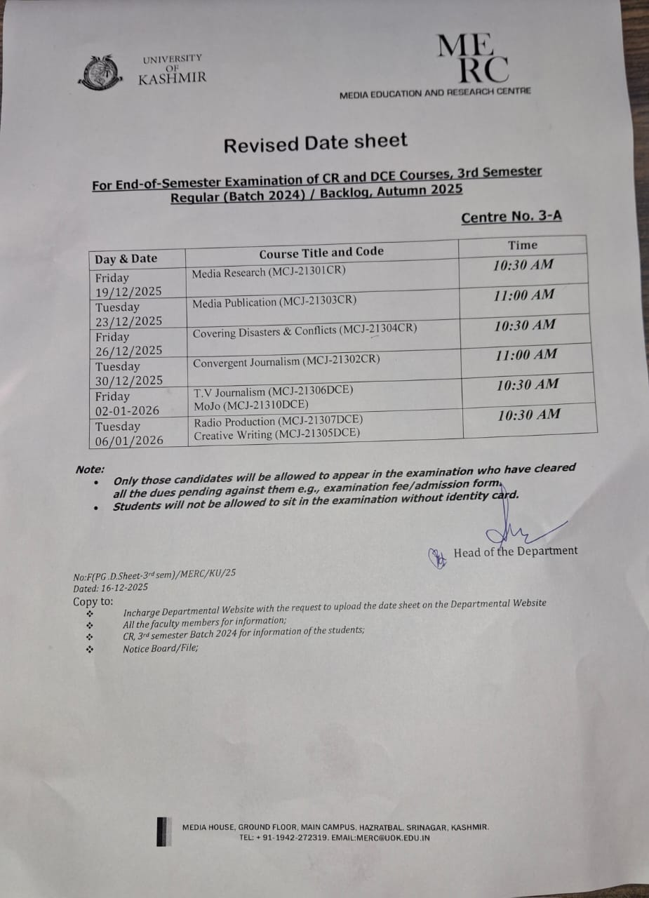 Revised Date sheet For End-of-Semester Examination of CR and DE Courses, 3rd Semester Regular (Batch 2024) / Backlog, Autumn 2025 Revised Date sheet View